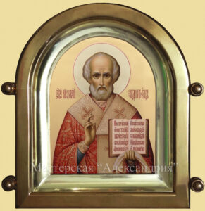 俄羅斯莫斯科「亞歷山大港」圖像工作室,作品「奇跡工作者尼古拉斯」,2013年,木材、畫布、石膏、葉子和人造彩色黃金、蛋彩畫、清漆,45×50 釐米。